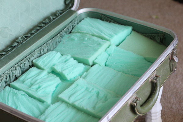 Step 4: Put a layer of foam in the bottom of the suitcase to raise the cushion just a little. I glued them all in place. Since the bottom of my suitcase, which will be the bottom of my chair, is a little deeper than the top, I wanted the pillow to stand up more. The foam just raises it up a little.