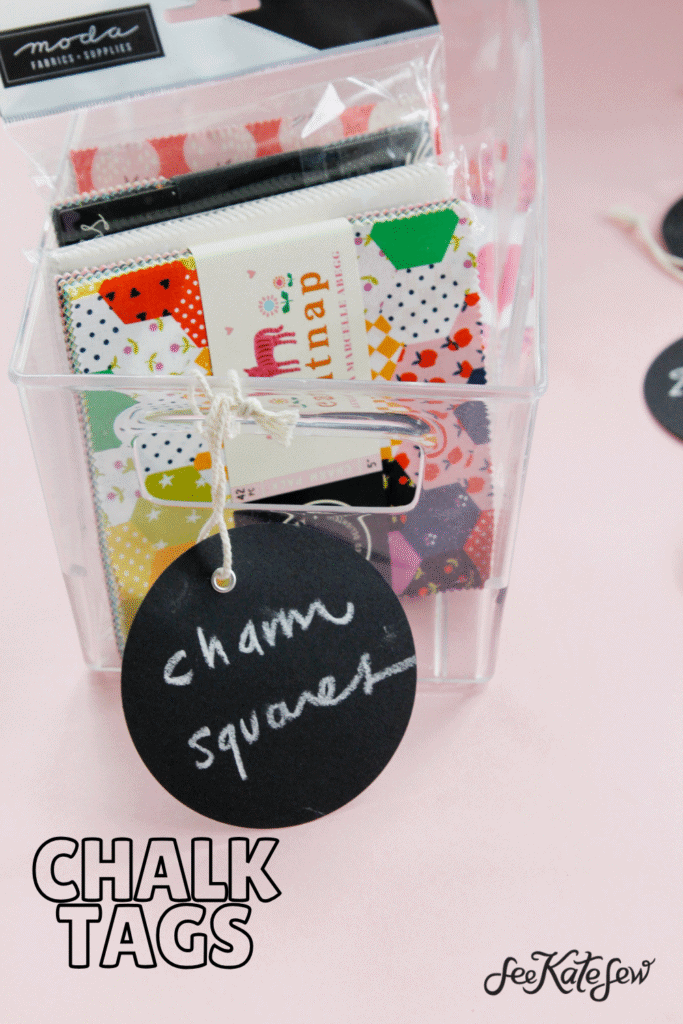 I have so many bins of fabric I decided it was time to label them and these chalkboard label tags are just so cute. I used a piece of chalk to write on them but then decided I should get a white paint marker so it doesn’t rub off! Just loop through your bin or basket handle.