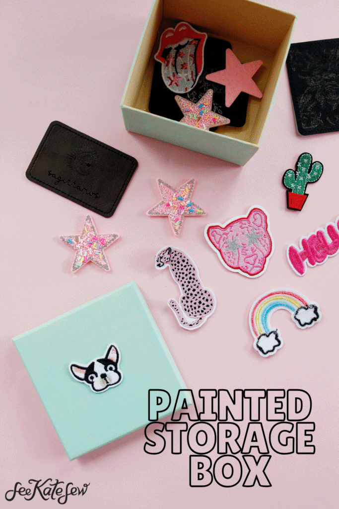 Paint your box, or leave it! Then glue some patches from the craft section onto the box! If you don’t have patches you can also use stickers, rhinestones, etc.