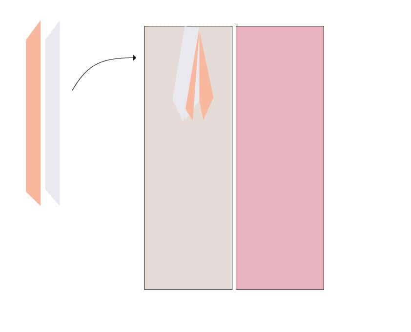 Cut two pieces of grosgrain ribbon about 5″ long. Clip the ends at a 45 degree angle to reduce fraying. Fold the ribbons in half and pin upside-down on one side of the bookmark.