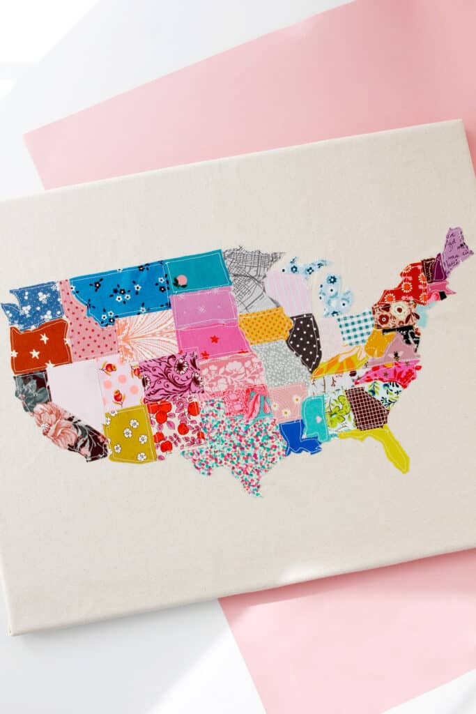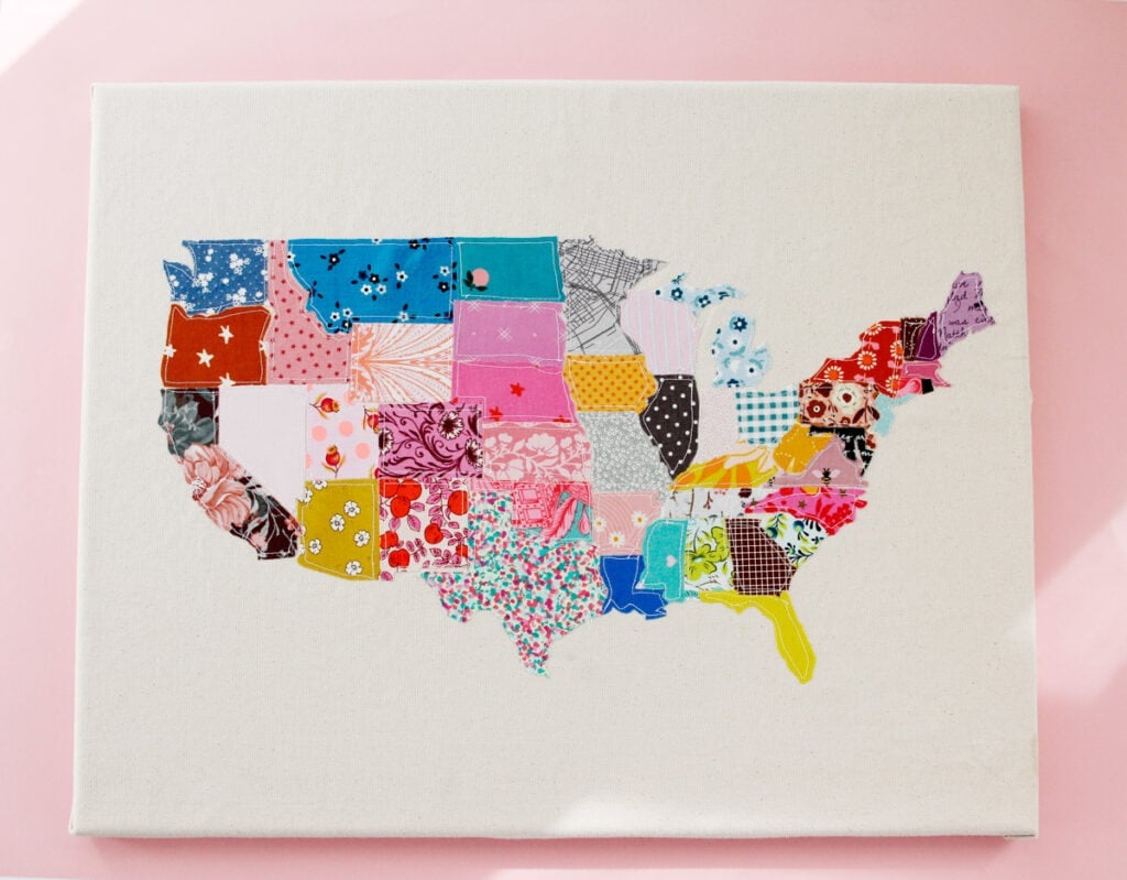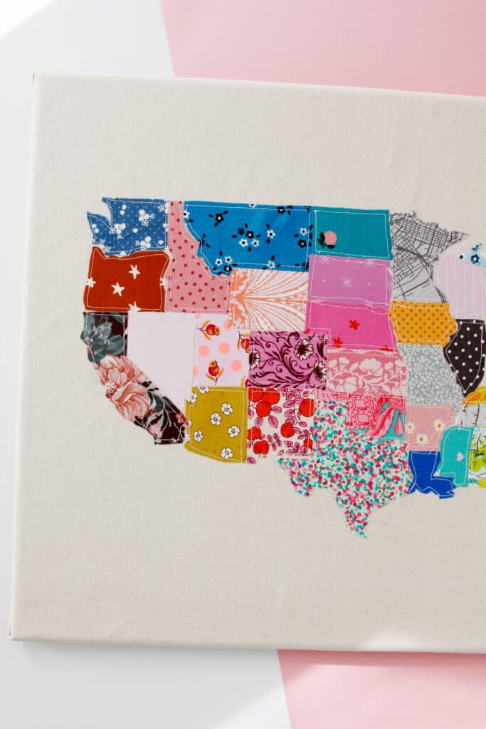 Then cut a piece of fabric for the backing, it should least 18″ tall by 22″ wide – if you plan to stretch it around a canvas or turn it into a another project you can adjust the size of your background fabric. Then start laying your states down. I like to start with the west coast since the states are bigger. They will connect like a puzzle. You can choose to overlap the states a tiny bit or leave some space in between. Either way will be beautiful!
