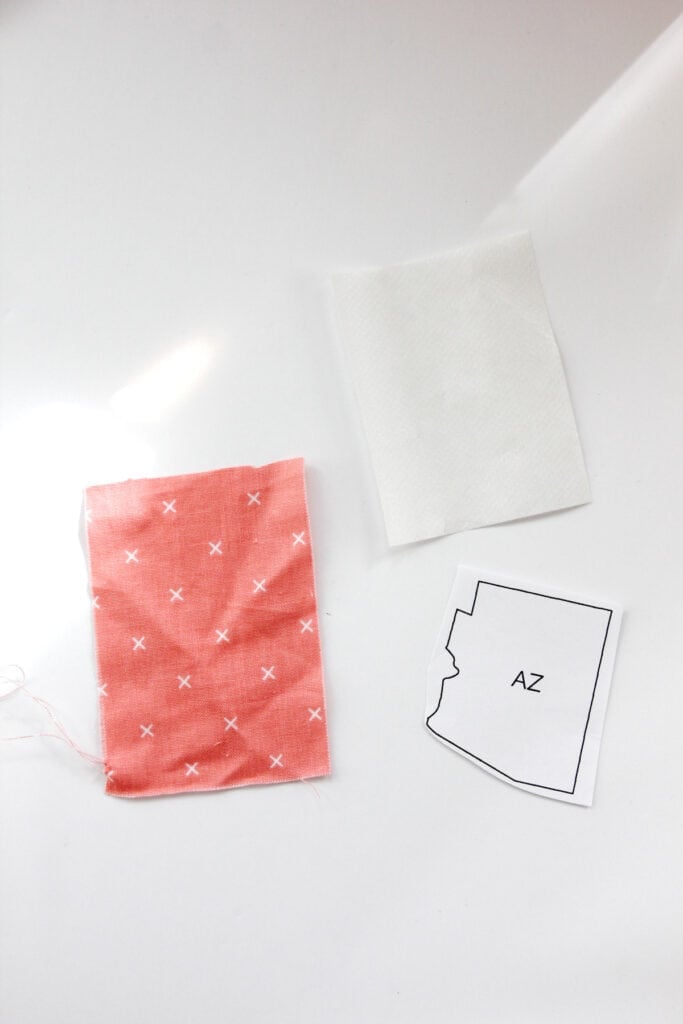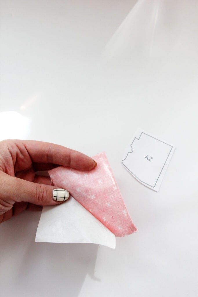 Start by finding scraps that will fit the size of each state. Cut a piece of Heat N Bond for the scrap – it should be just a little bit smaller than the fabric.