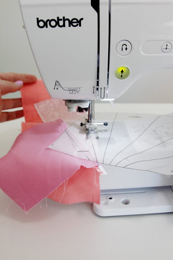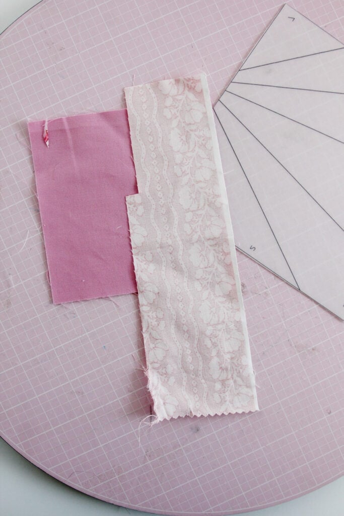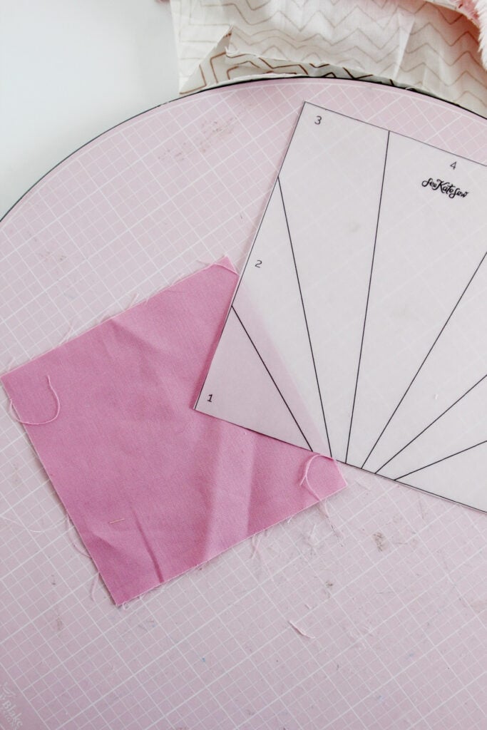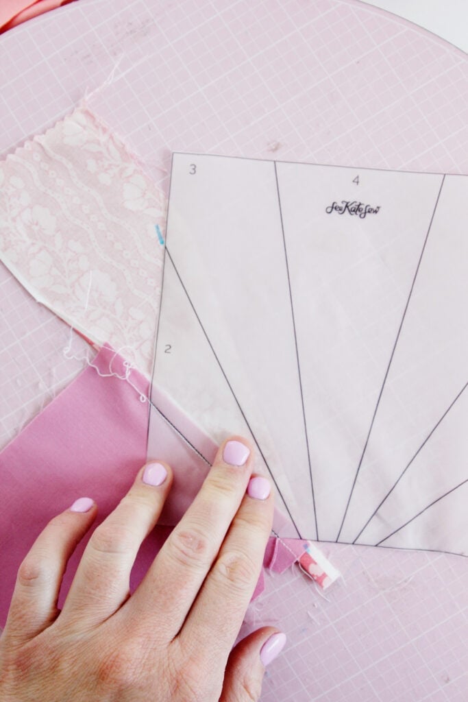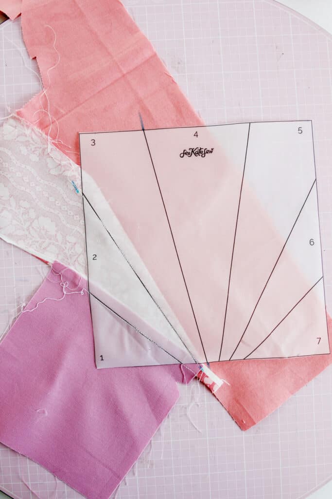 Start by finding a scrap of fabric big enough for the section #1. Place it behind the template, overlapping the line by about 1/4.”