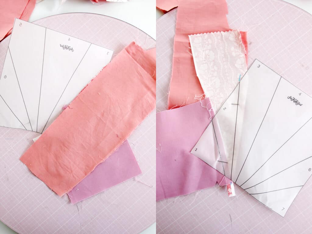 Flip the template and fabric over. Now find a scrap big enough for section 2 and place it right on top of the first scrap, lined up with the edge.