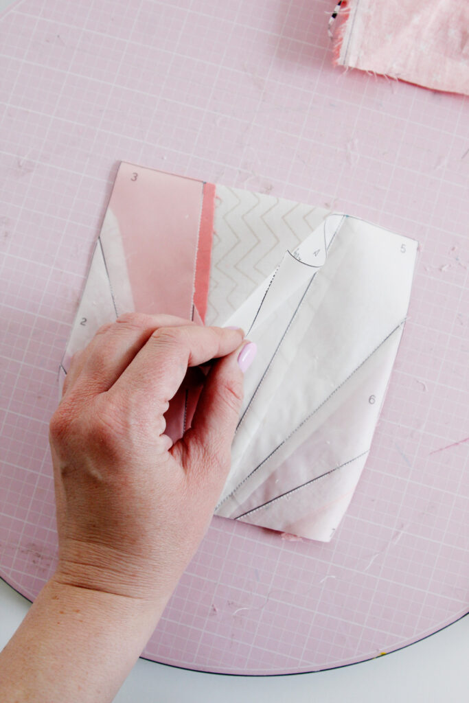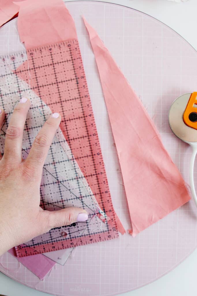 Trim off some of the excess fabric if you want to. I like to mark the points of the line with a fabric marker. Then use a ruler to cut off the excess, leaving about 1/2″ past the line. Be sure to fold all the other fabrics and the template out of the way before trimming.