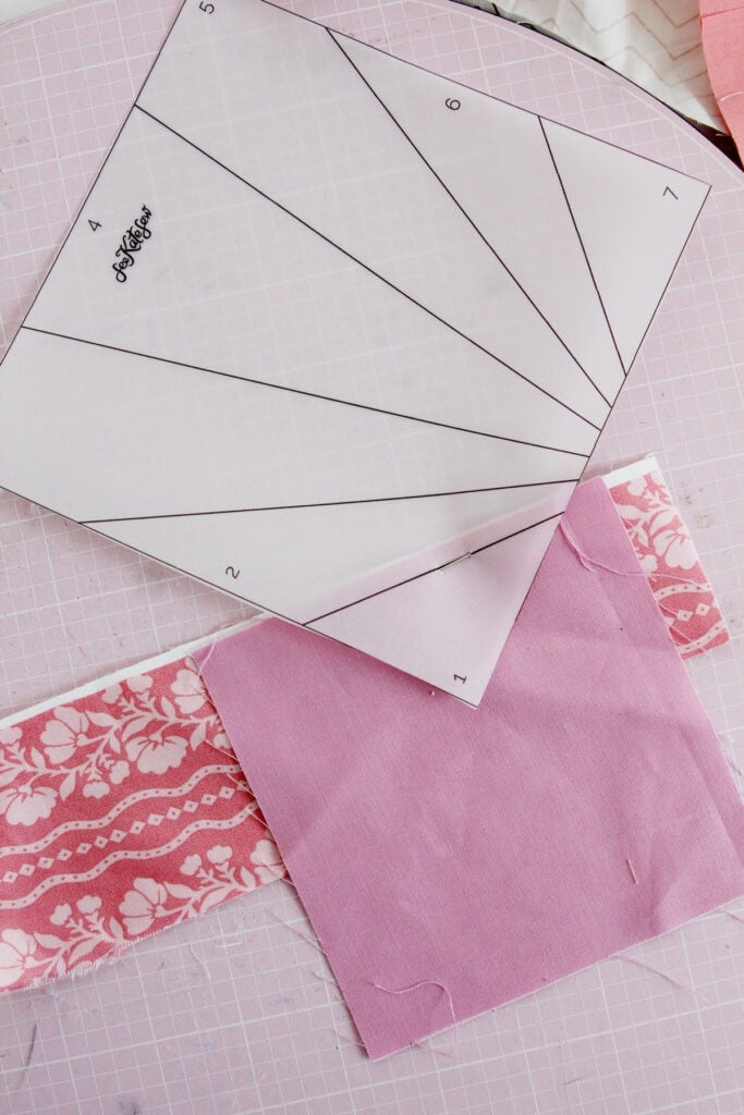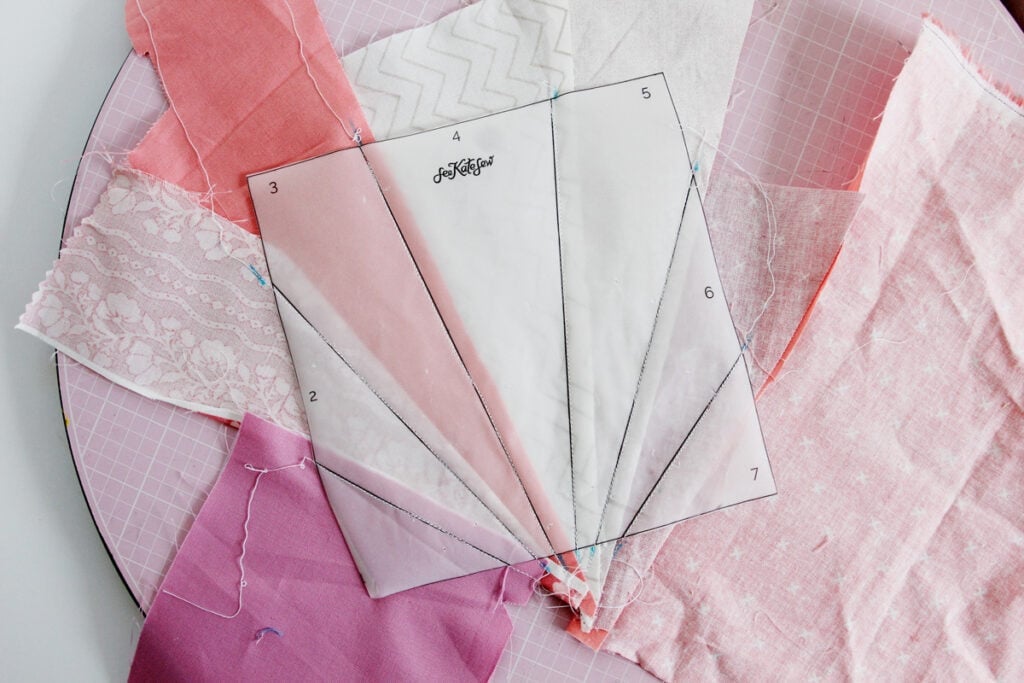 - Make sure your scrap will cover the section of your FPP by folding it over before sewing