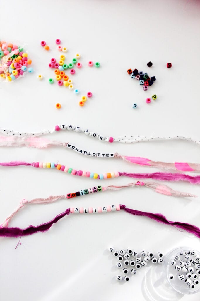 To make these, cut a strip of fabric about 1/2″ wide. The easiest way to do this is to clip the end of your fabric and tear. Make sure you even the fabric up with a tear first, see the video! Then tie a knot and thread the fabric through your needle’s eye. Thread as many beads on as you wish and then tie another knot!