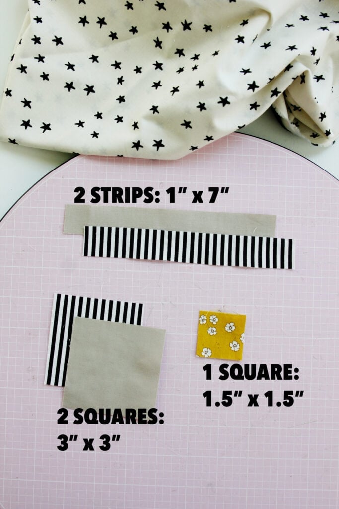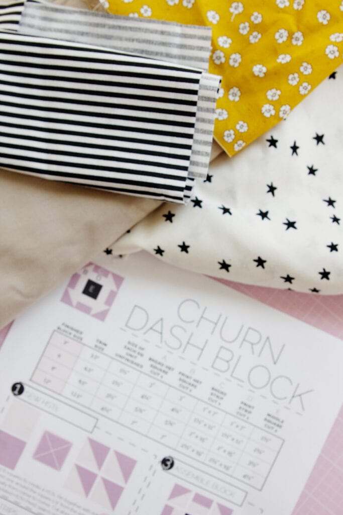 For the churn dash block panel you’ll need 4 different fabrics. 3 colors will be used for the blocks and the other color will be the background of the panel.
