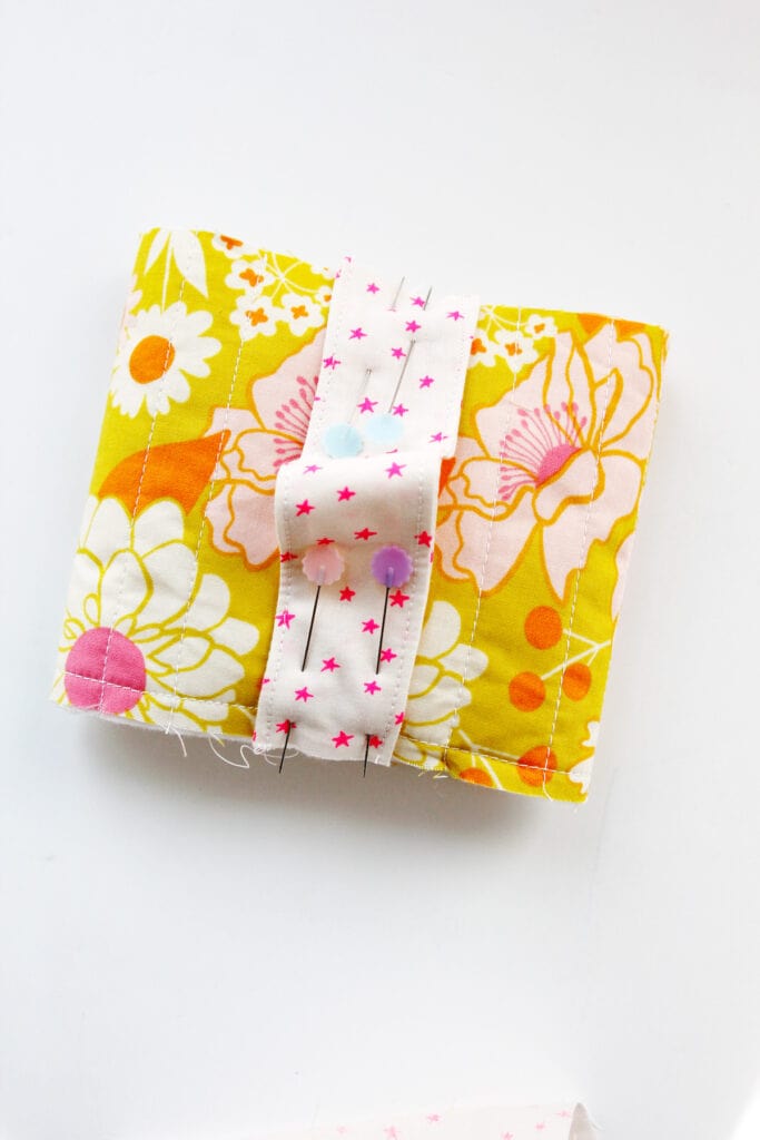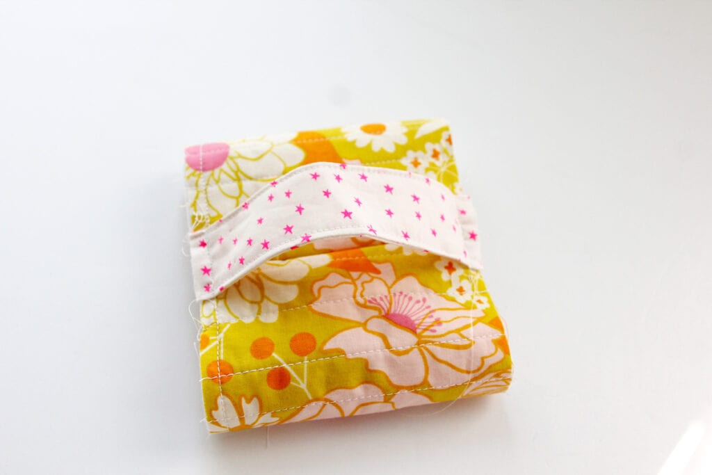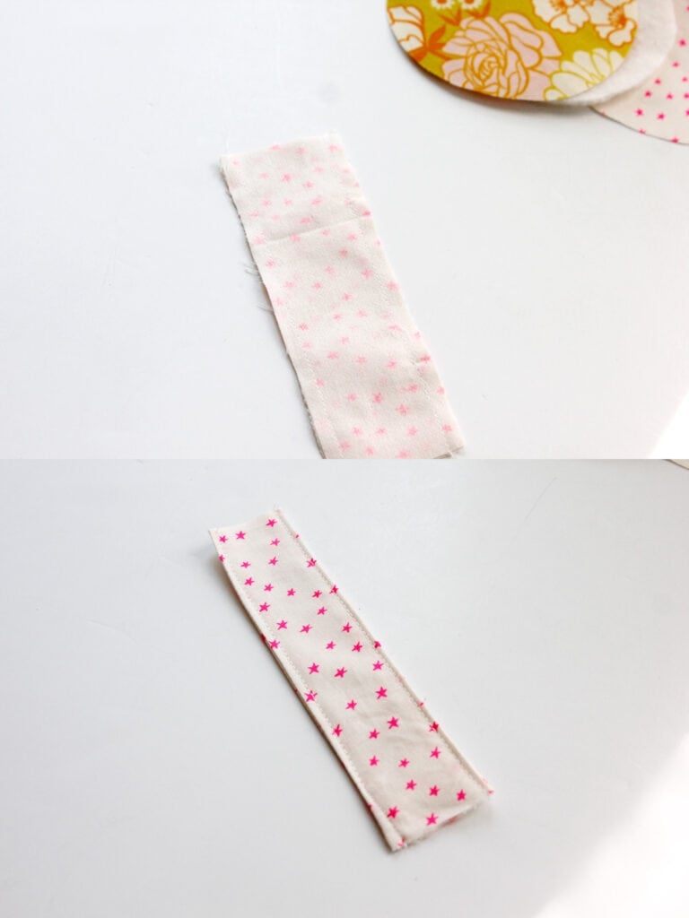 Optional: Make the handle by sewing the two handle pieces together into a tube, along the sides 1/4″ from the edges. Turn rightside out and press. Then topstitch close the both sides.