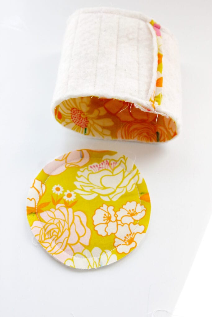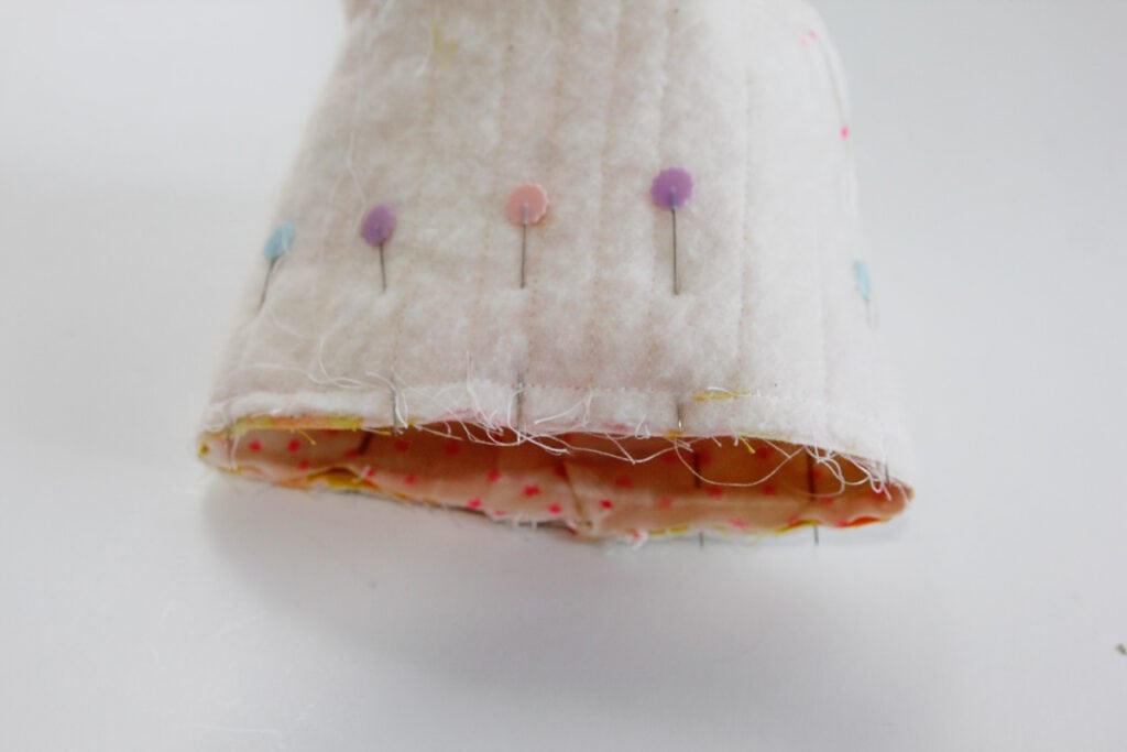 Slip the lining inside the main cozy with right sides together. Match along the top edge and stitch all the way around the cylinder with a 3/8″ seam allowance.