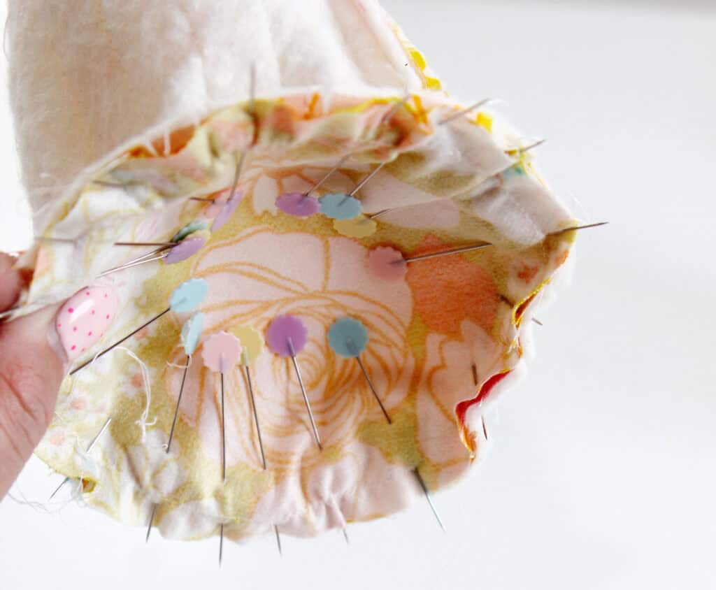 Pin the main base into the main fabric cylinder with right sides together. Use lots of pins and pull the stay stitching if you need to. You may want to clip the seam allowance before sewing, just keep your clips to about 1/4″ or less, making sure not to pass 3/8″ from the edge because that is where the seam allowance will go.