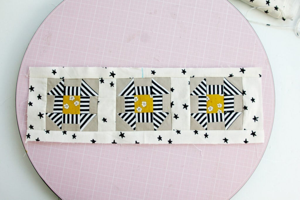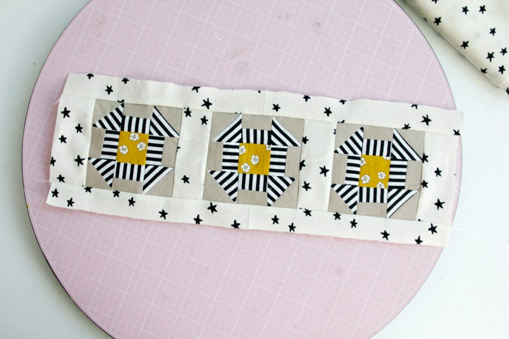 Cut 4 side/middle pieces. Sew the quilt blocks together with a middle pieces in between. Then sew the side pieces to the sides. Press seam allowances away from the quilt blocks. Sew the top and bottom pieces on and press seam allowances out.