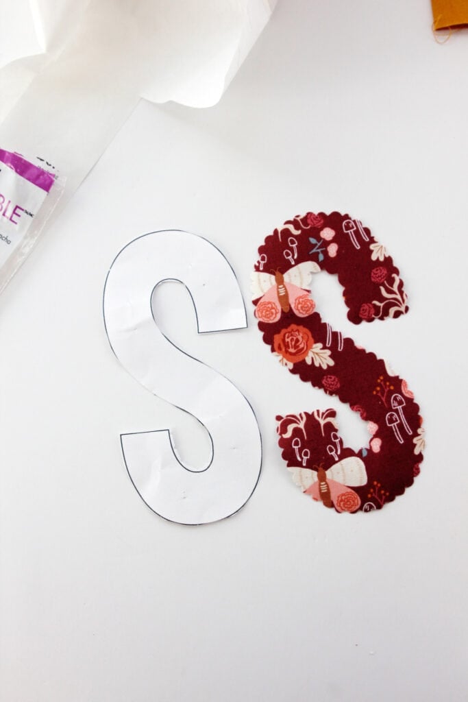Then pin the letter to the front and use your scissors to cut out the letters carefully. If you are using pinking shears, cut the scallop shape on the outside of the template.
