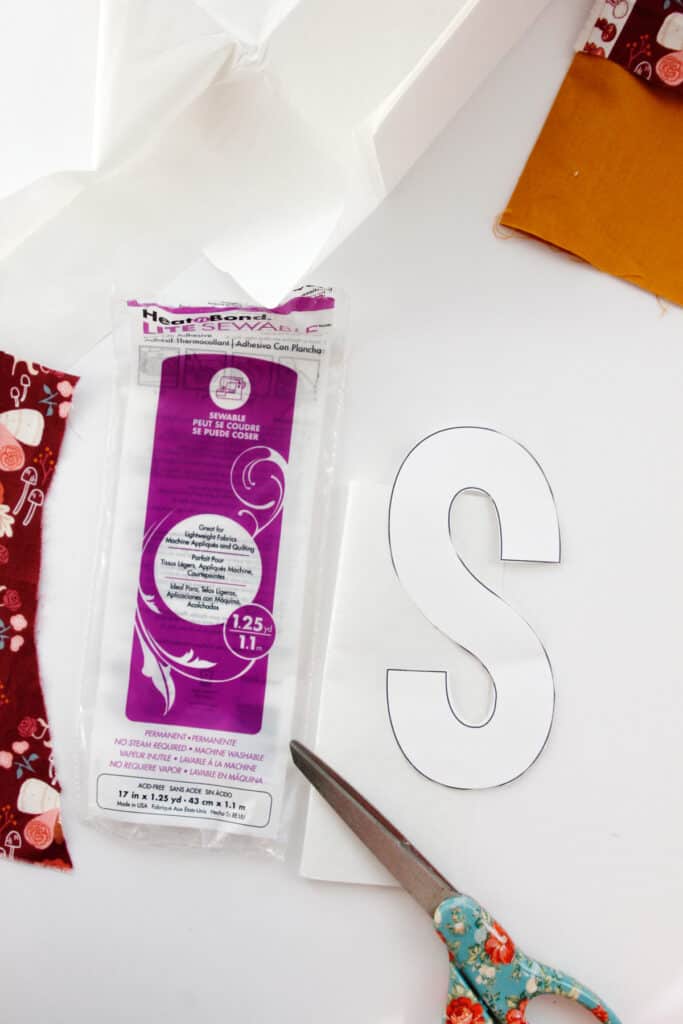 Cut out a piece of fabric for behind the letters. Since my letters all fit on 1 sheet of paper, I used 8.5″ x 11″ for that panel. You can adjust for your name and pillow size and shape. Make sure you have at least 3/4″ of extra space around where your letters will be.