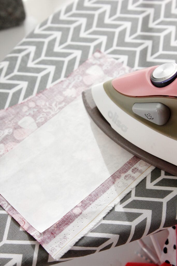 Arrange the letters on the panel and then use your iron to fuse them down. Topstitch around the letters with your sewing machine making sure to stay under where the scallops hit, or about 1/8″ from the edges.