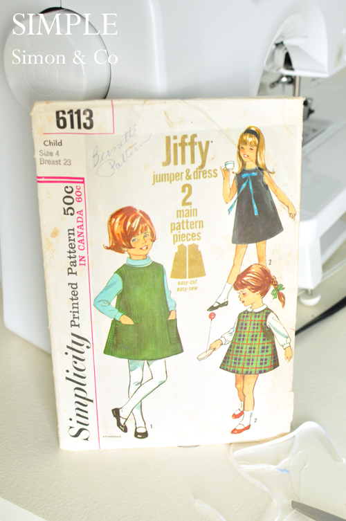 For the pattern, I used this little vintage beauty in my stash…..but there are A-line jumper patterns still made today. Here is a good resource for a modern simple one with the same lines (you just have to imagine it….without all the…um, lovely trims.)